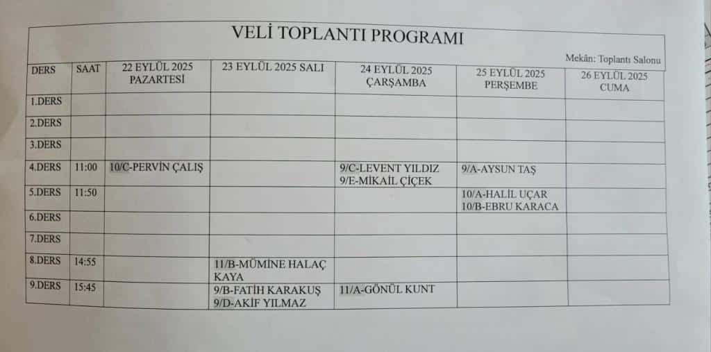 VELİ TOPLANTI SAATLERİMİZ